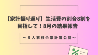 家計振り返り 【家計振り返り】生活費の割合8割を目指して!8月の結果報告 2025年8月の家計簿を振り返り。生活費割合は113%、貯蓄率は−13%。旅行や夏休みイベント、家具購入で出費増でしたが、買い物改善の工夫や思い出も収穫できた月でした。 2025.10.04 家計振り返り